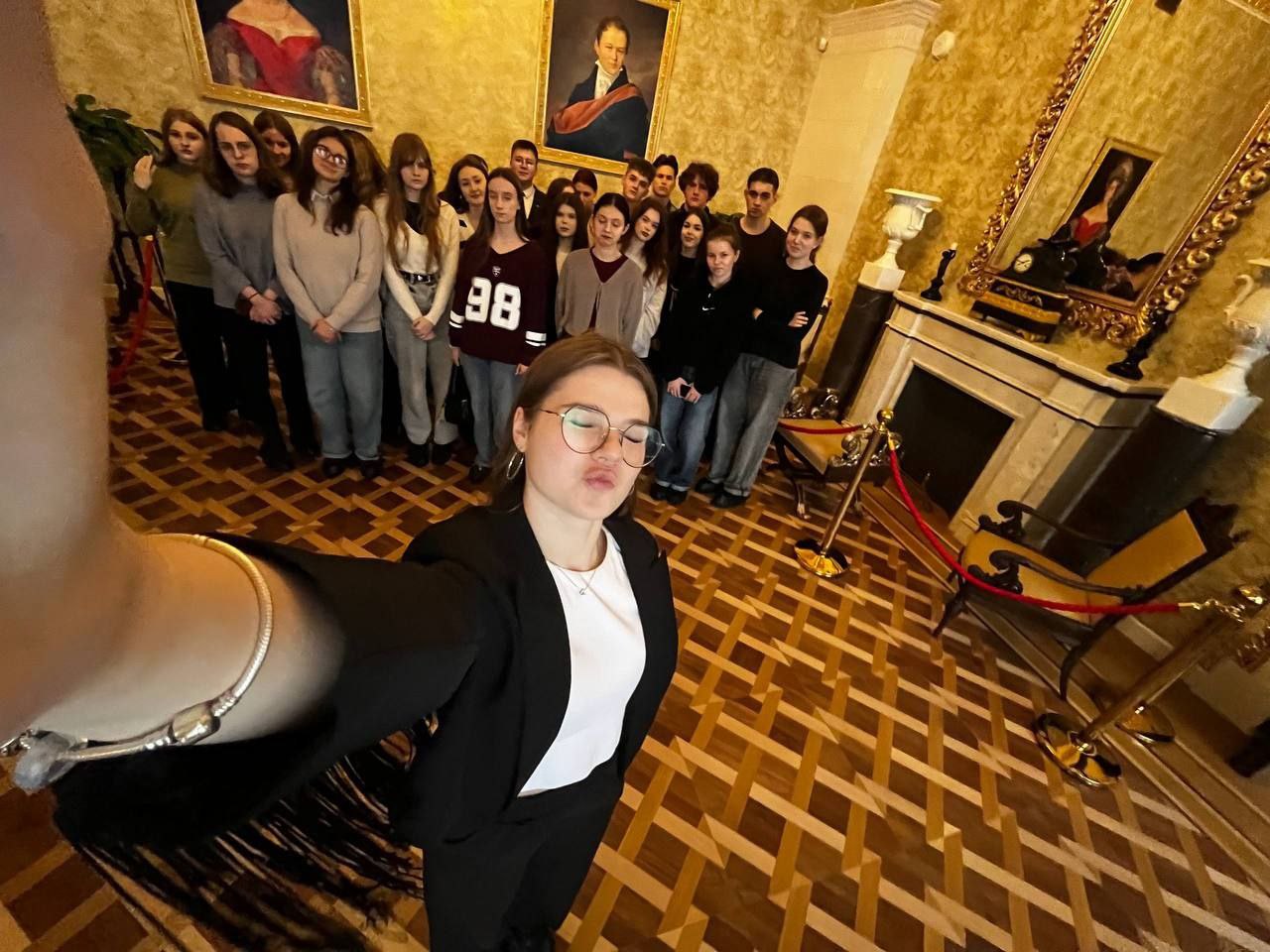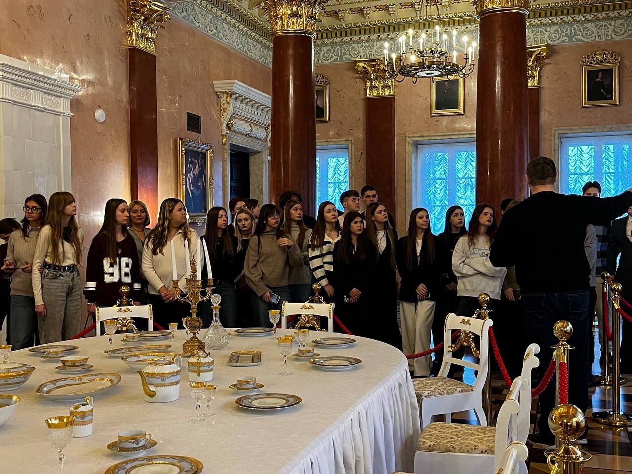 Во время экскурсии студенты узнали, что внутри дворца есть уникальная ложная резная дверь-обманка, сделанная исключительно для симметрии. Она ведет в глухую стену, потому что владелец, Игнатий Булгак, требовал от архитекторов безупречной гармонии во всем, даже ценой таких хитростей.