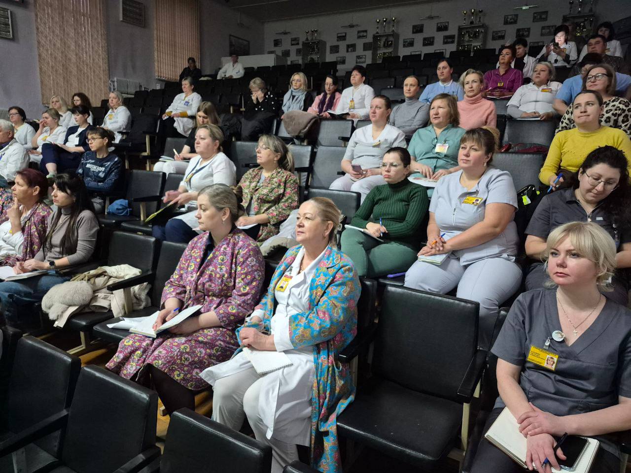 На встрече собрались те, от кого напрямую зависит безопасность каждого работника: руководители и старшие медсестры структурных подразделений, а также общественные инспекторы по охране труда больницы.